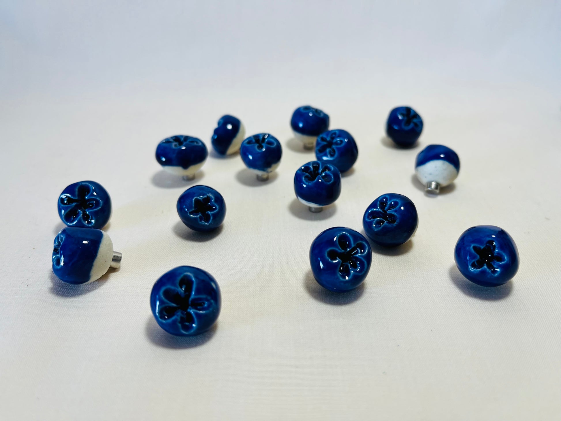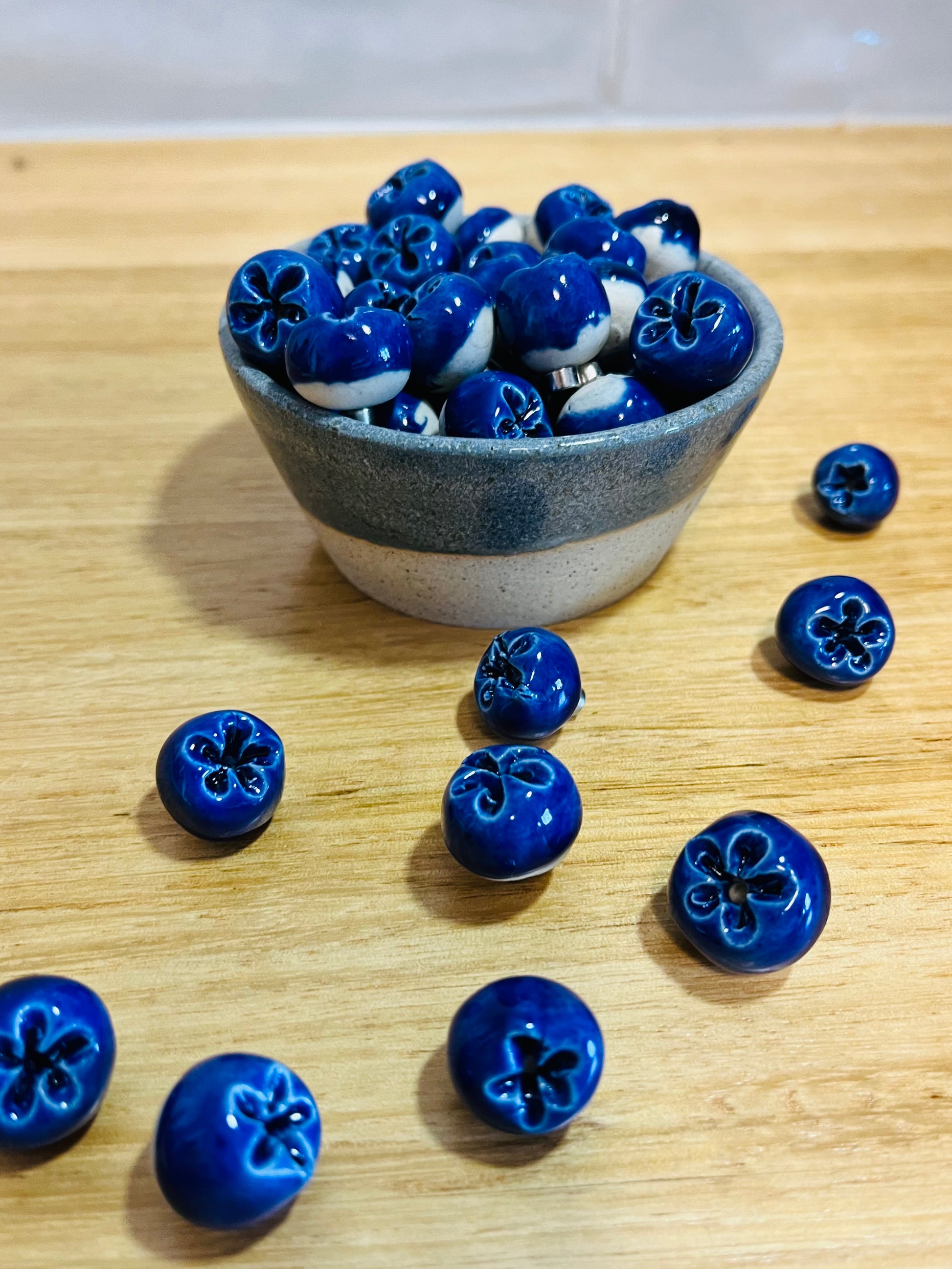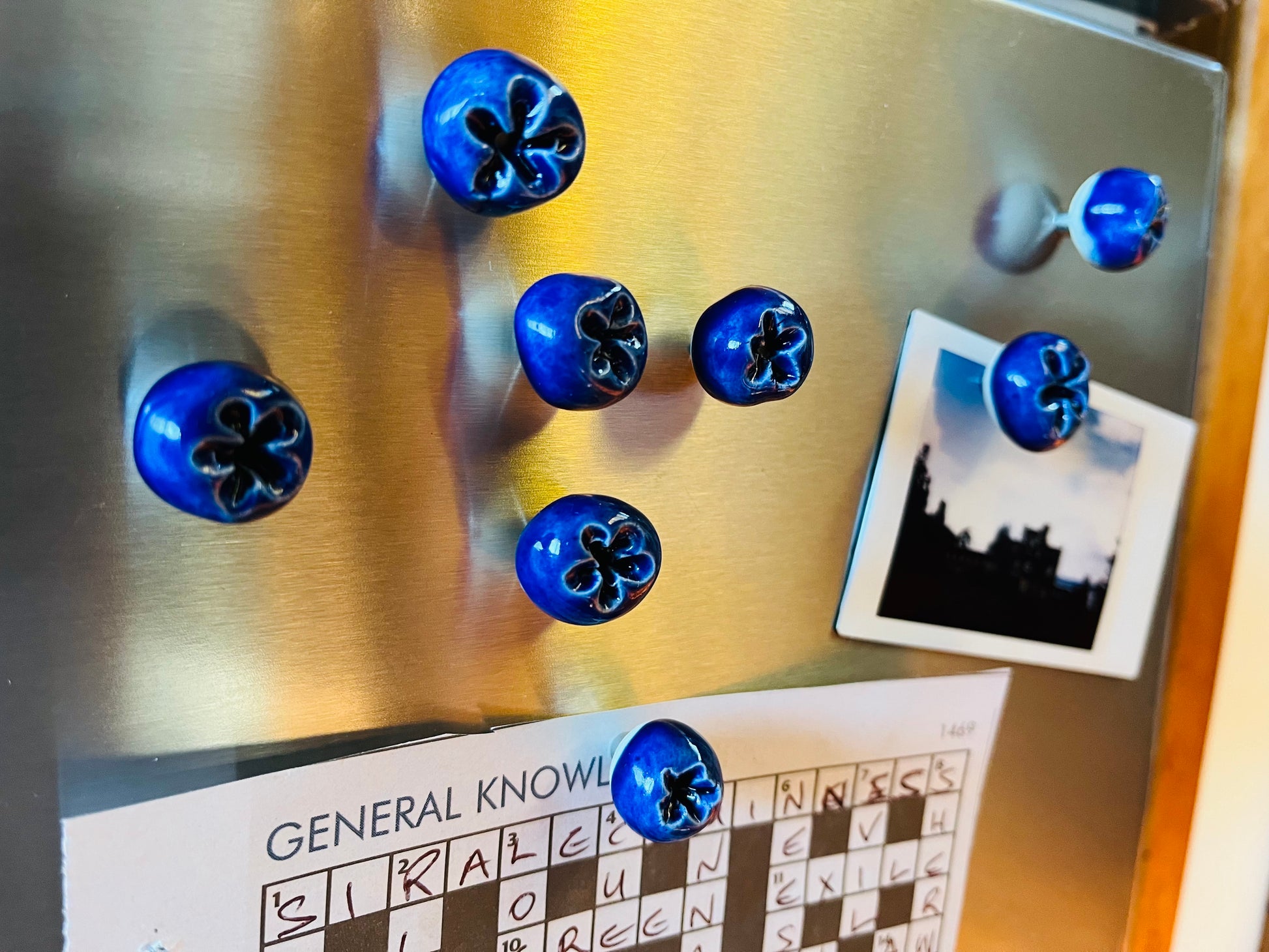 Handmade ceramic blueberries glazed in a rich cobalt blue, each with a strong magnet attached to the base. Their rounded forms and subtle dimples give them a satisfyingly plump, tactile feel — playful, sweet, and a little bit cheeky. Slight variations in shape and finish make each one unique, adding a sculptural touch to your fridge, pinboard, or any magnetic surface.