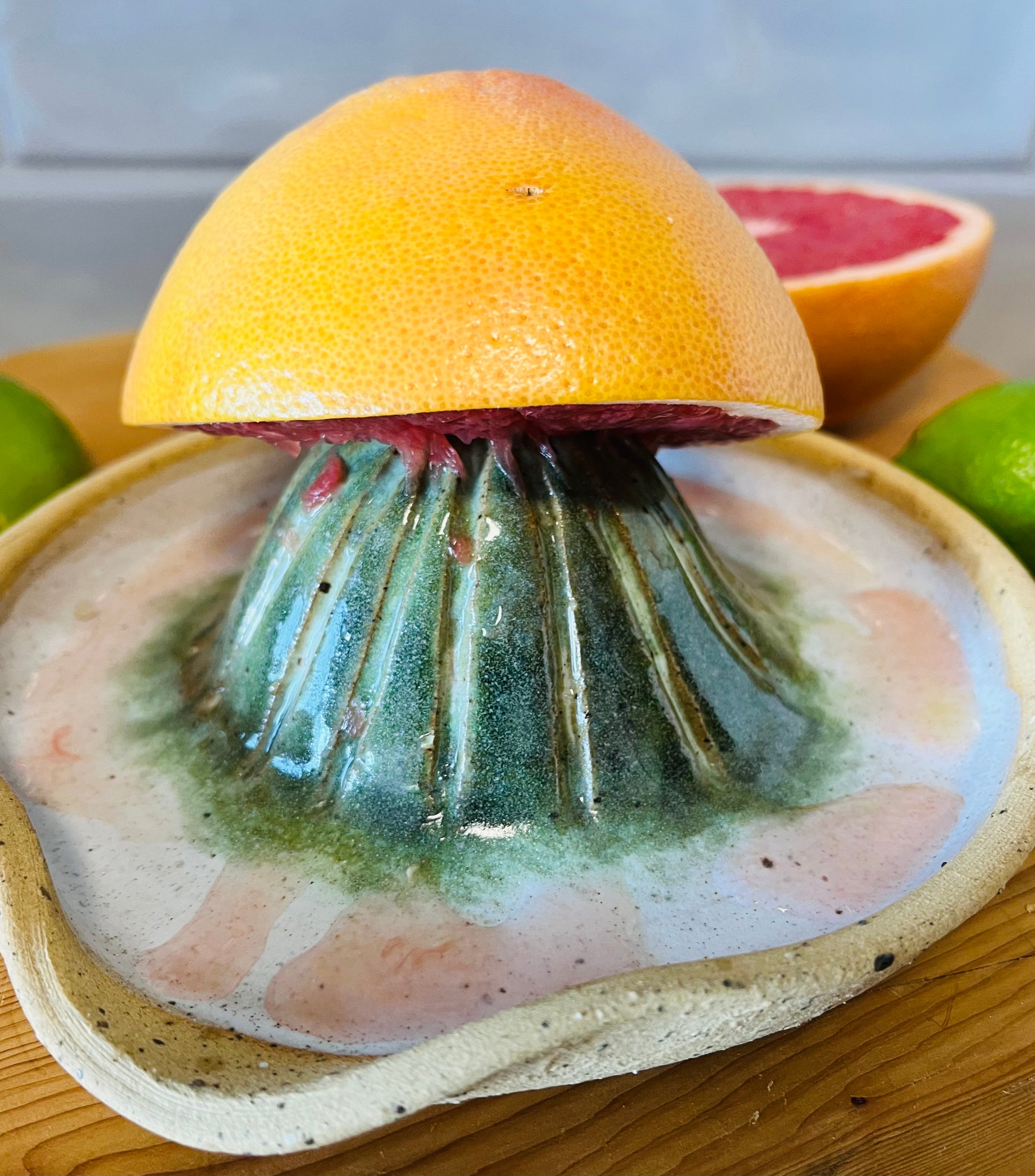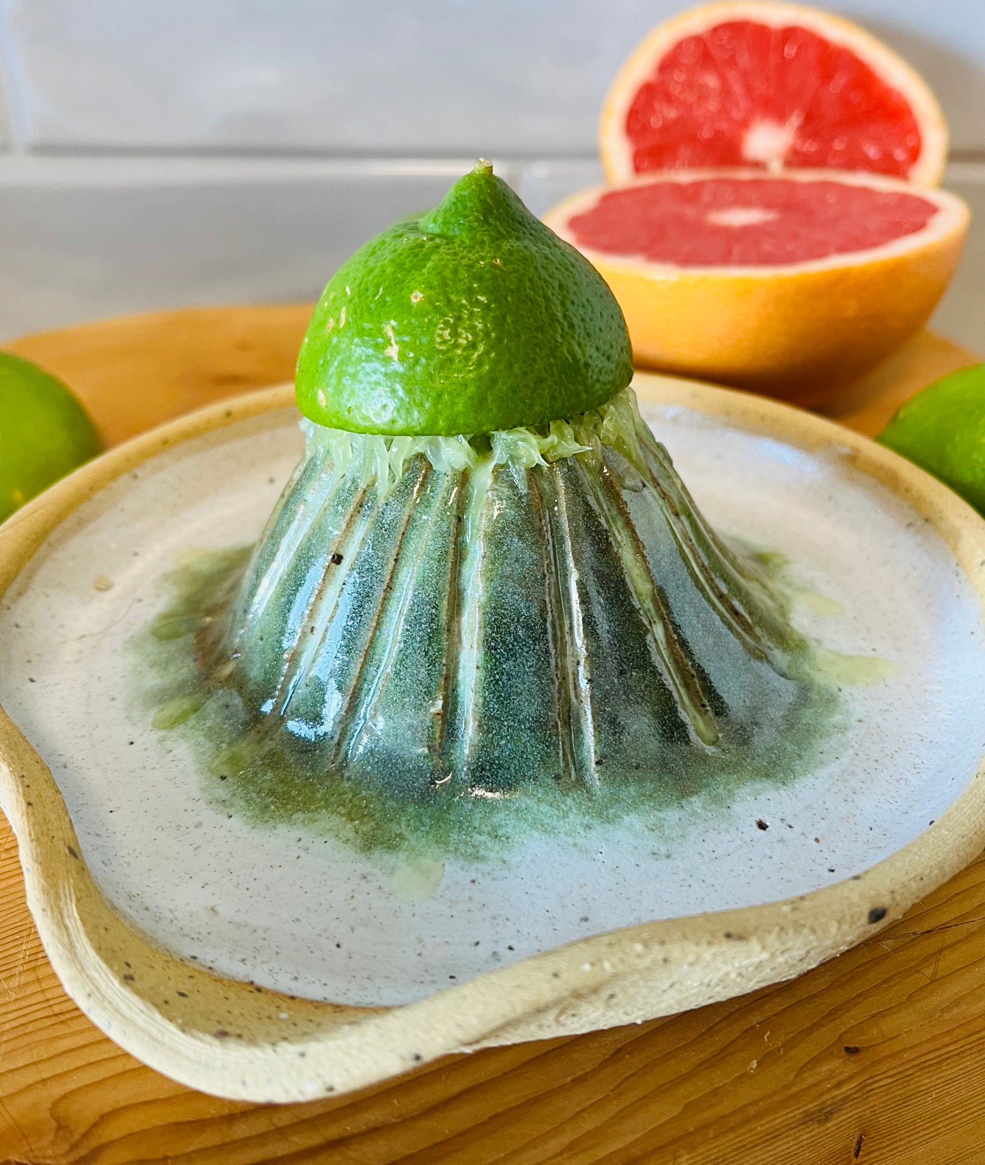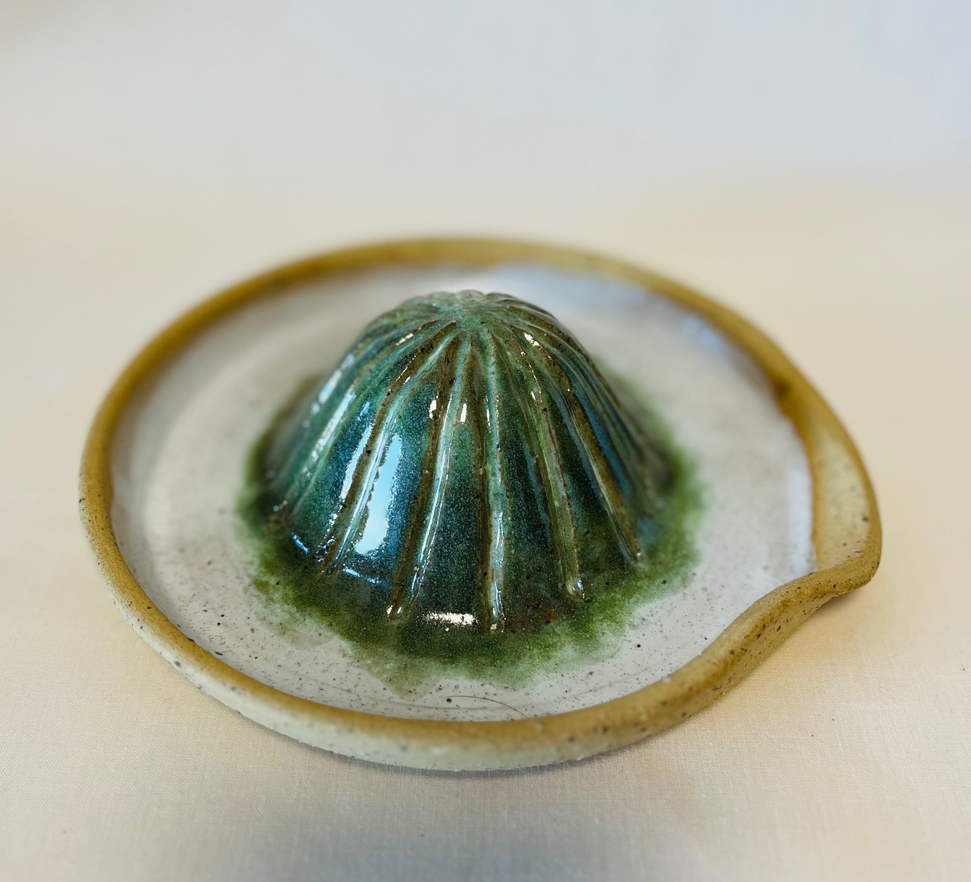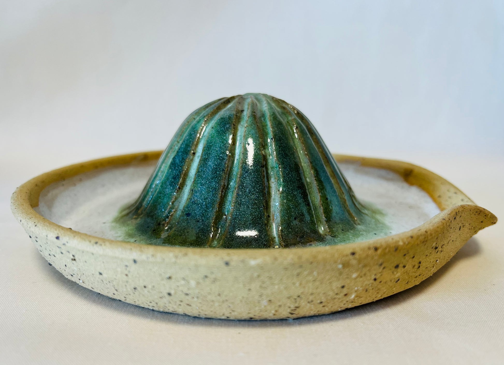 A wheel-thrown citrus juicer with a fluted dome and wide, gently sloping rim to catch every drop. Perfect for lemons, limes, oranges or grapefruit — whether it’s morning juice or a finishing squeeze for a dressing or dish. Glazed in soft howlite white with amazonite green pooling over the cone and into the moat, set against warm, sandy clay. Beautiful enough to leave out, practical enough to use every day. A small spout at the edge lets you pour juice exactly where it’s needed. Steady, satisfying, and easy to rinse. A matching garlic grater in the same glaze and clay is also available in a separate listing.