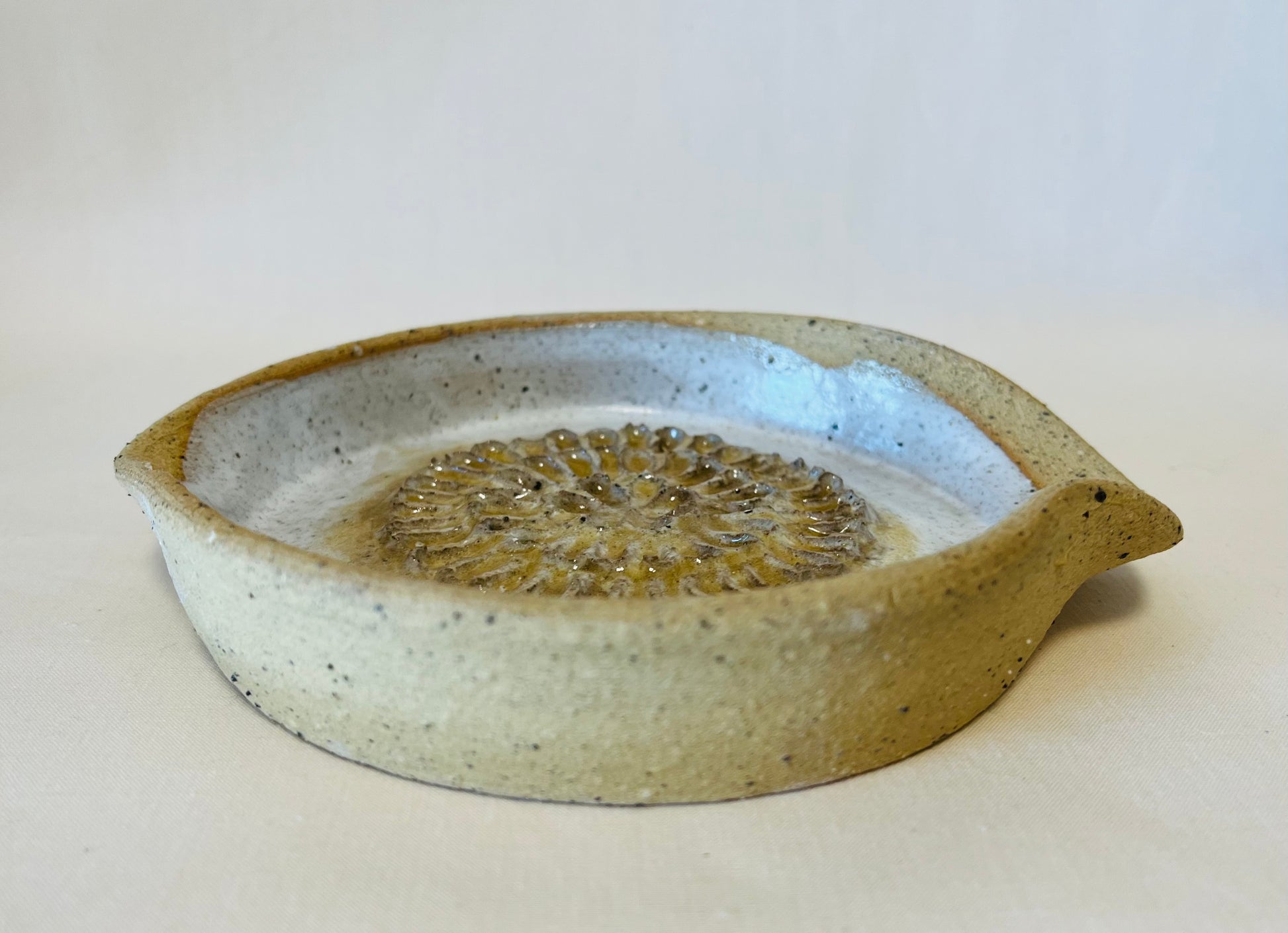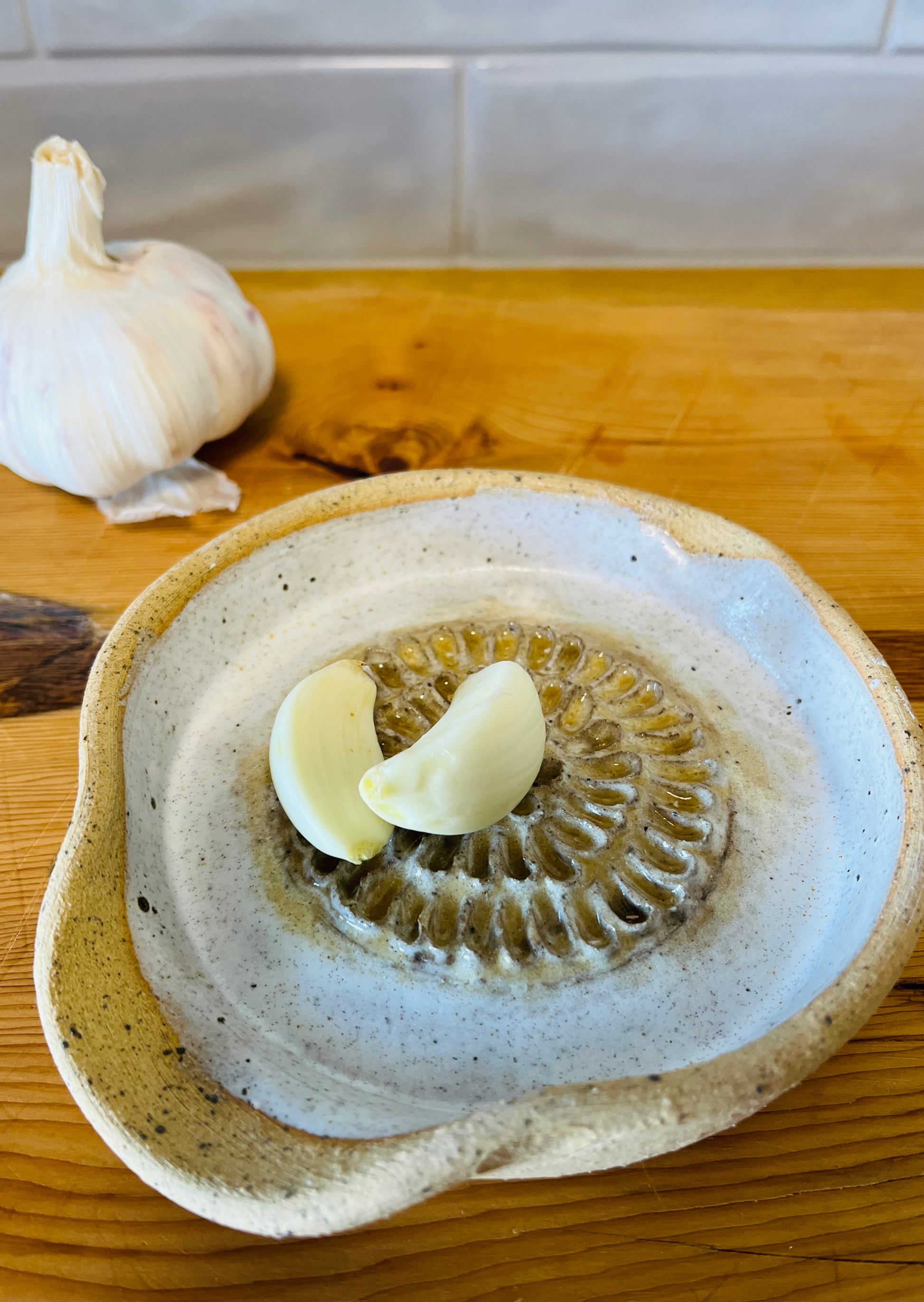 A ridged ceramic dish for grating garlic or ginger into a smooth, flavour-packed paste — no chopping, no fuss. Easy to use, simple to rinse, and surprisingly satisfying. Glazed in white howlite with gentle speckles and a centre of warm copal — a soft, mustard-toned glaze — set over a sand-coloured clay base. Earthy, bright, and quietly beautiful — you won’t want to put it away. A matching juicer in the same glaze and clay is also available in a separate listing.