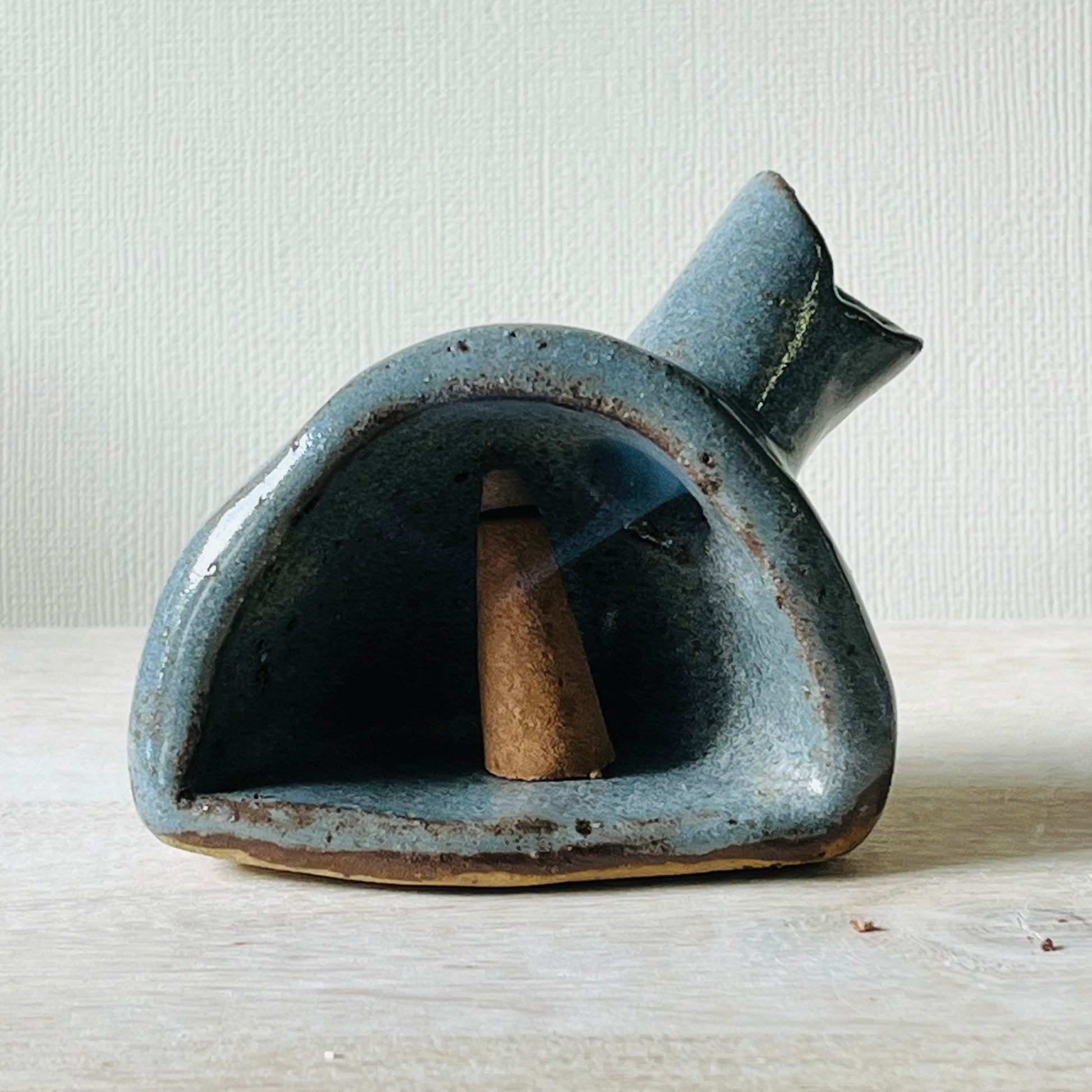 A compact incense holder shaped to shelter a burning cone and catch the ash. The angled chimney helps guide the smoke upward while the curved base keeps the cone stable. Finished in a slate blue glaze with natural variation across the surface. Each piece has its own slight differences in form. If there is one that particularly catches your eye, contact me via the ‘contact page’ otherwise let me choose for you.