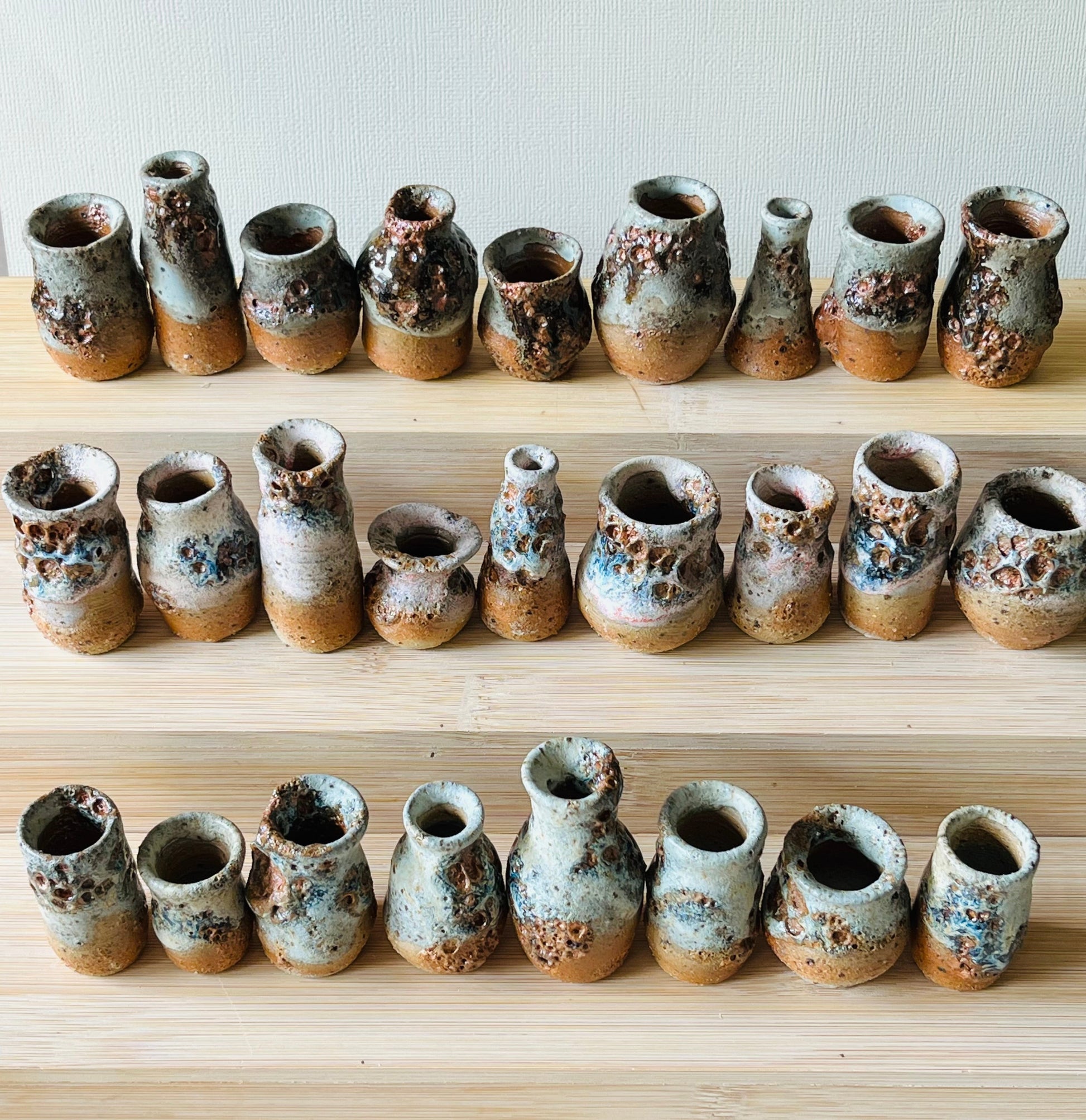 These miniature vases are hand thrown on the wheel and finished in layers of blush pinks and blues with touches of rusty quail green. The surface features beautiful organic speckling created through a gentle glaze reaction, giving each piece its own character. Every vase is individually shaped so no two are ever the same.
