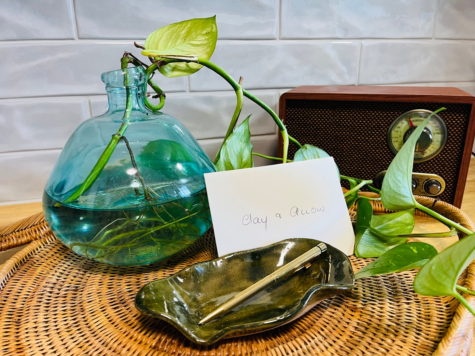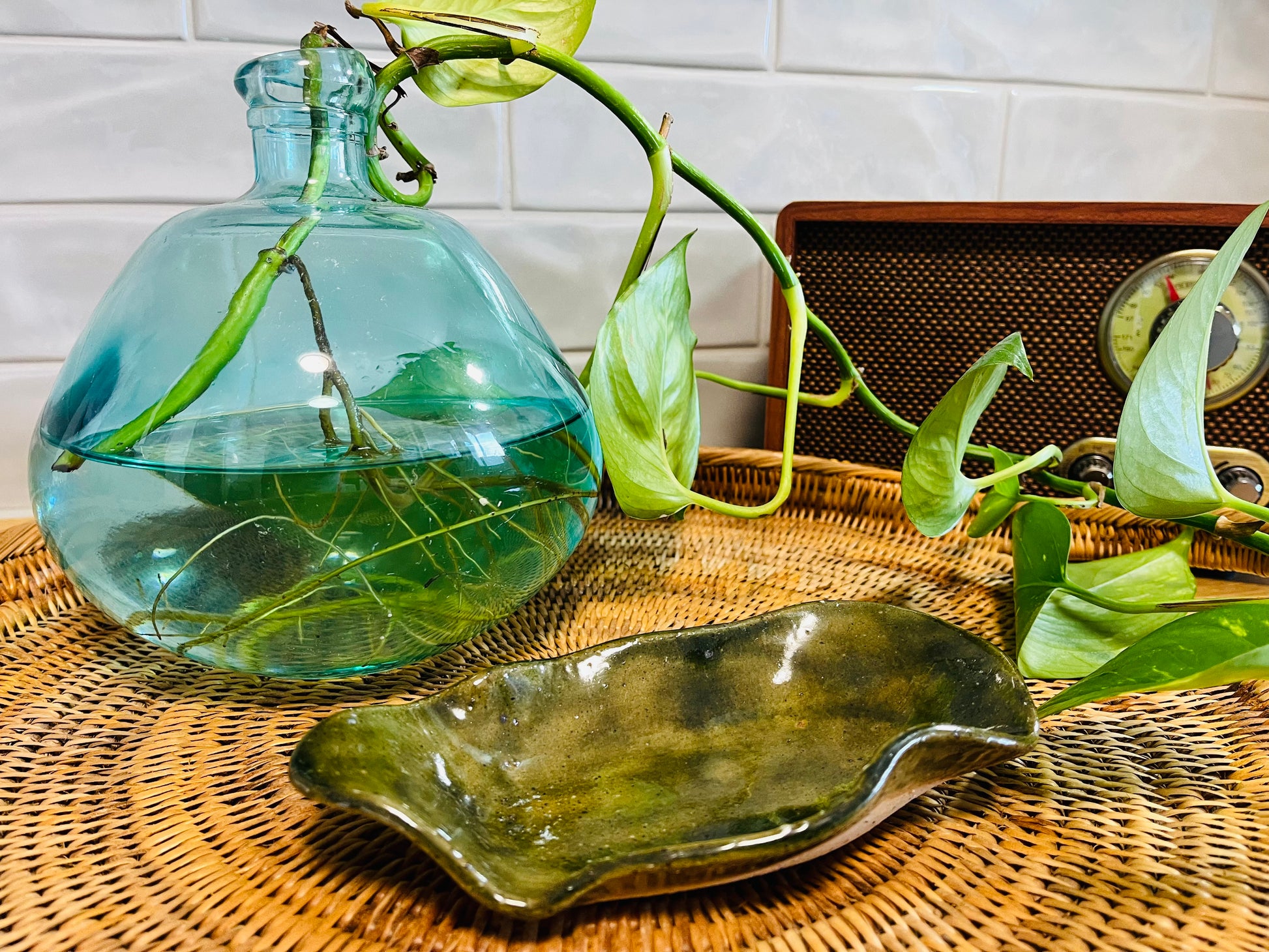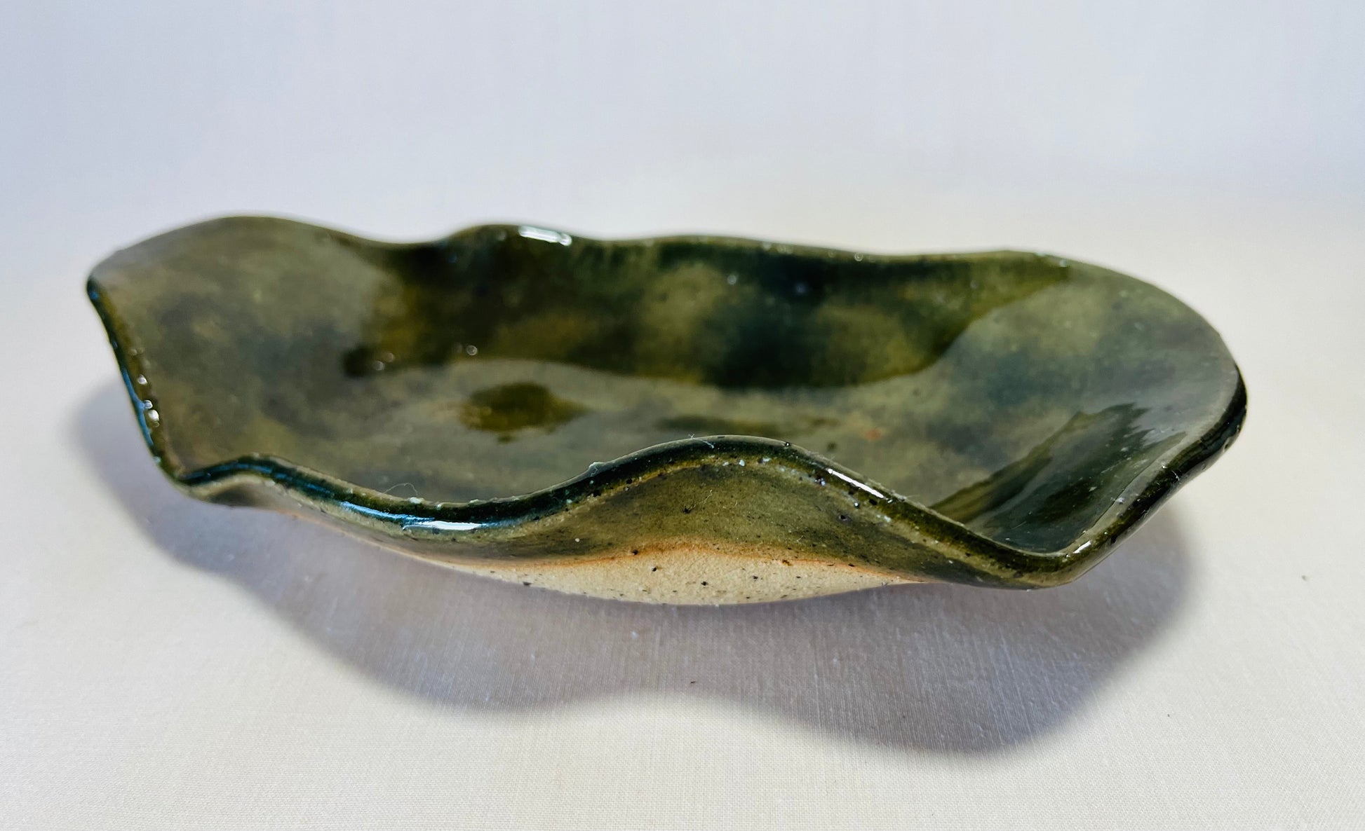 This hand-formed ceramic dish features an undulating, irregular rim and a rich moss-toned glaze. The flowing form gives the piece a natural, sculptural quality.