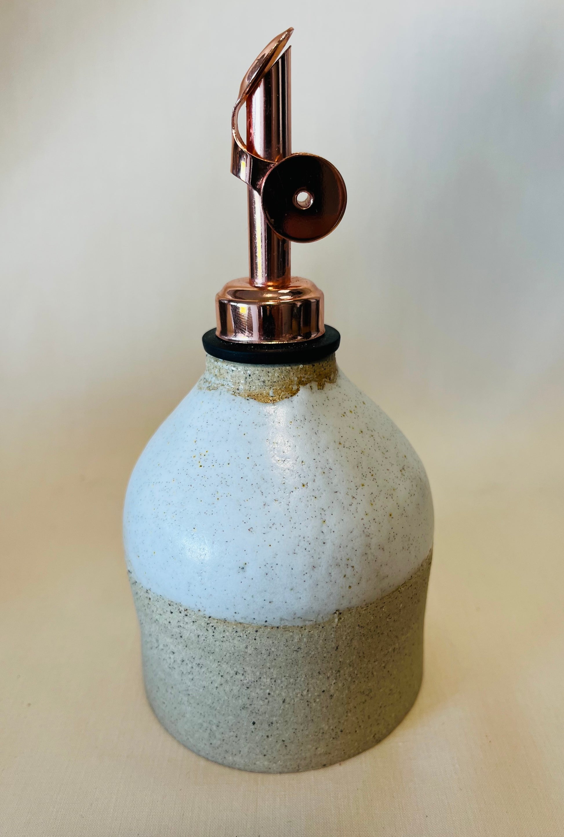 A pourer for oil, vinegar or dressing — perfect for a drizzle, not a flood. Compact and balanced, it sits neatly on the bench without taking over. The copper spout fits snugly but lifts out easily for cleaning. Half howlite glaze with soft speckles, half warm clay. Two others are listed separately — similar in scale, each with its own curve. A great excuse to mix and match.