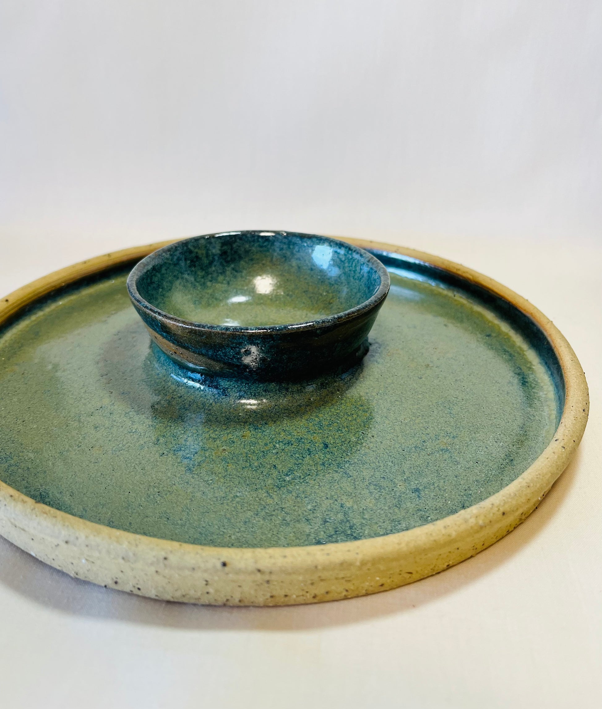 This softly curved chip-and-dip platter pairs form and function with ease. The rounded bowl flows naturally from the base—perfect for salsa, hummus, or your favourite dip—while the surrounding plate fits just enough to graze. Glazed in soothing amazonite tones with green-blue depth and warmth, it’s ideal for relaxed snacking or a casual platter between friends.