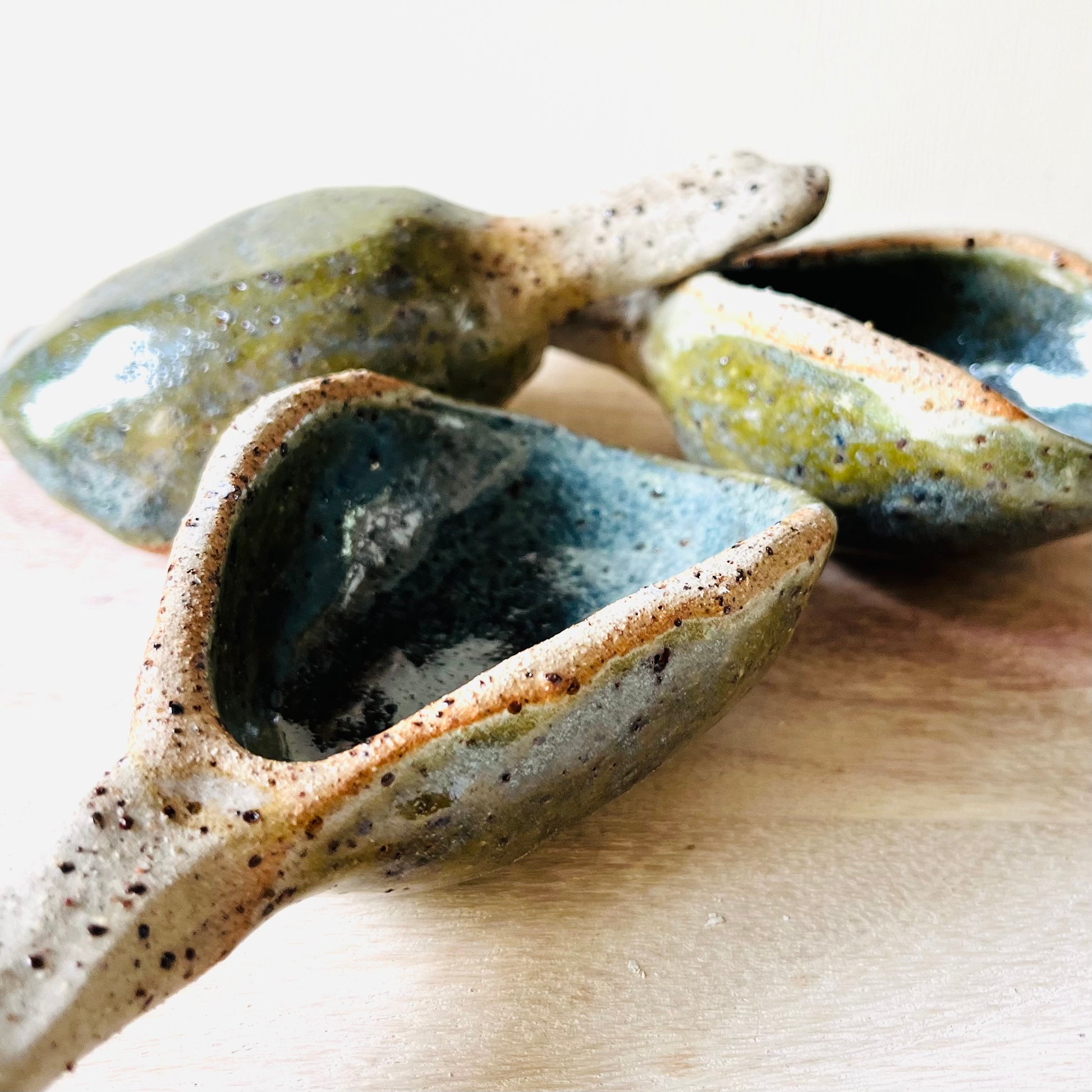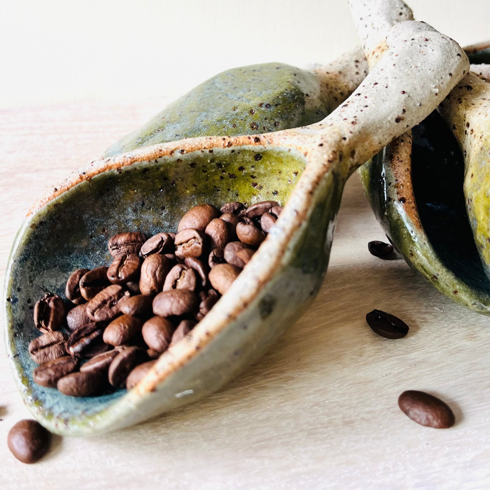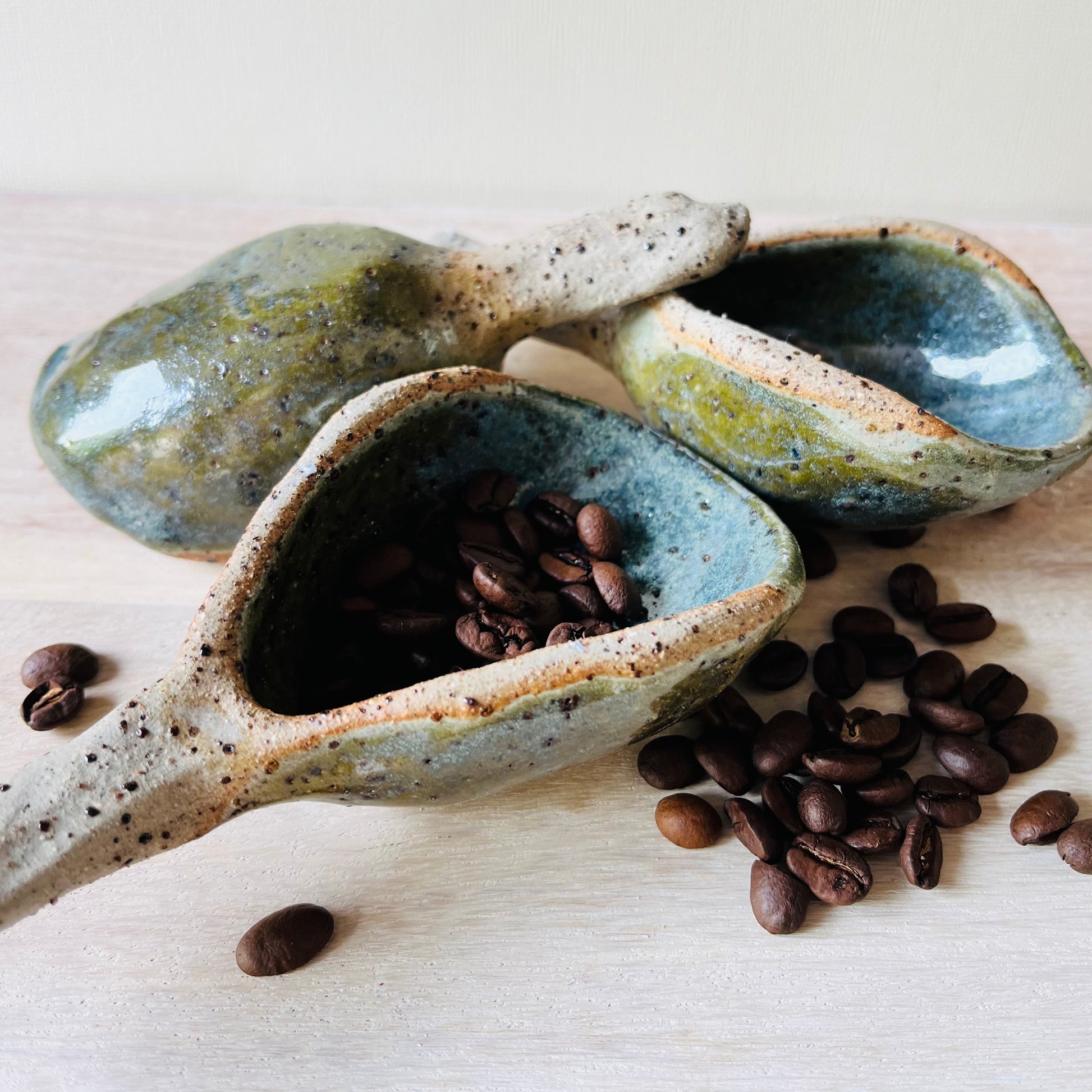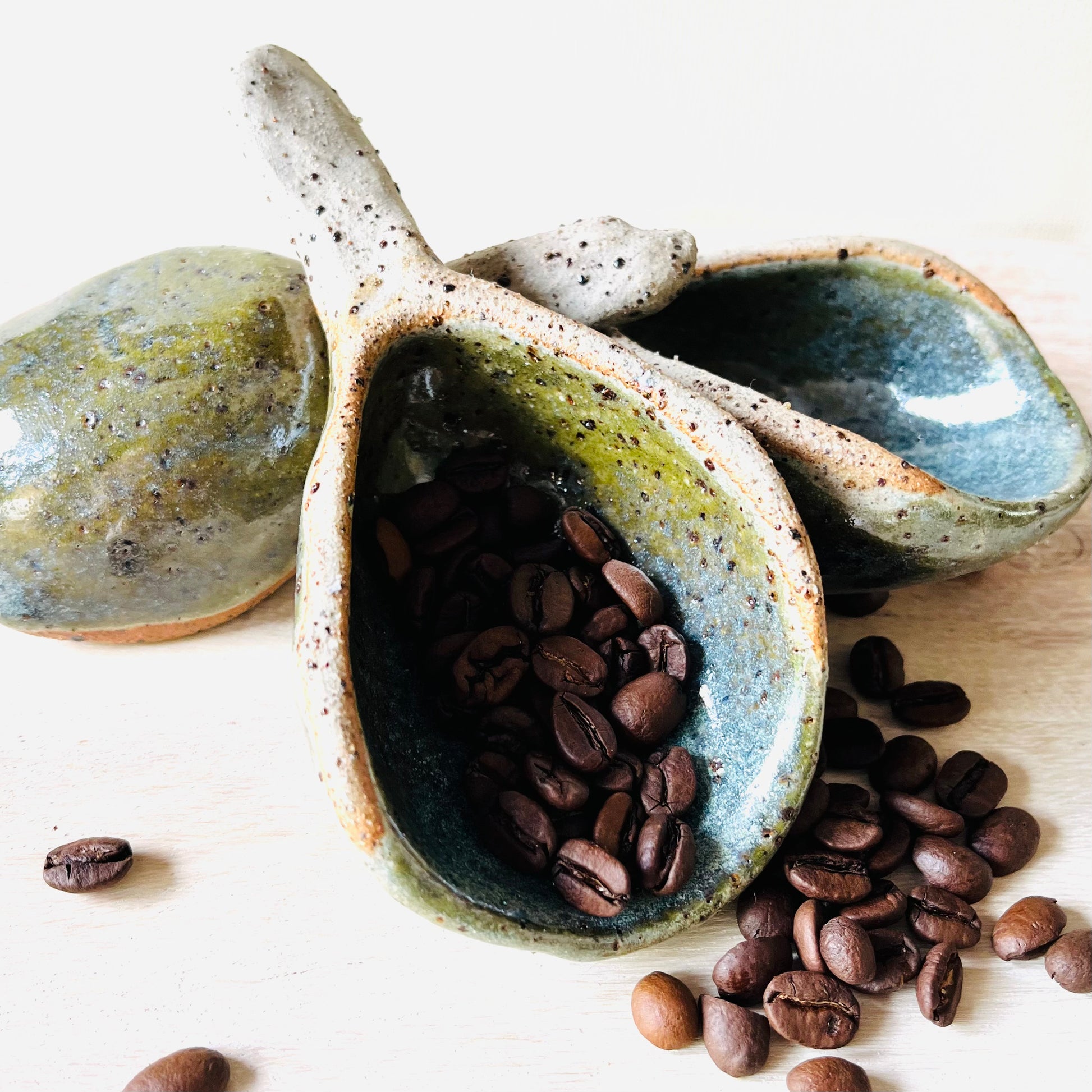 Hand built scoops designed for coffee beans, flour, sugar, grains and other dry goods. Made from stoneware clay and featuring natural speckle off the trachyte that shows through the glaze. An amazonite green glaze moves into soft blues, creating variation across each piece. Practical, tactile and made to be used and left on display.