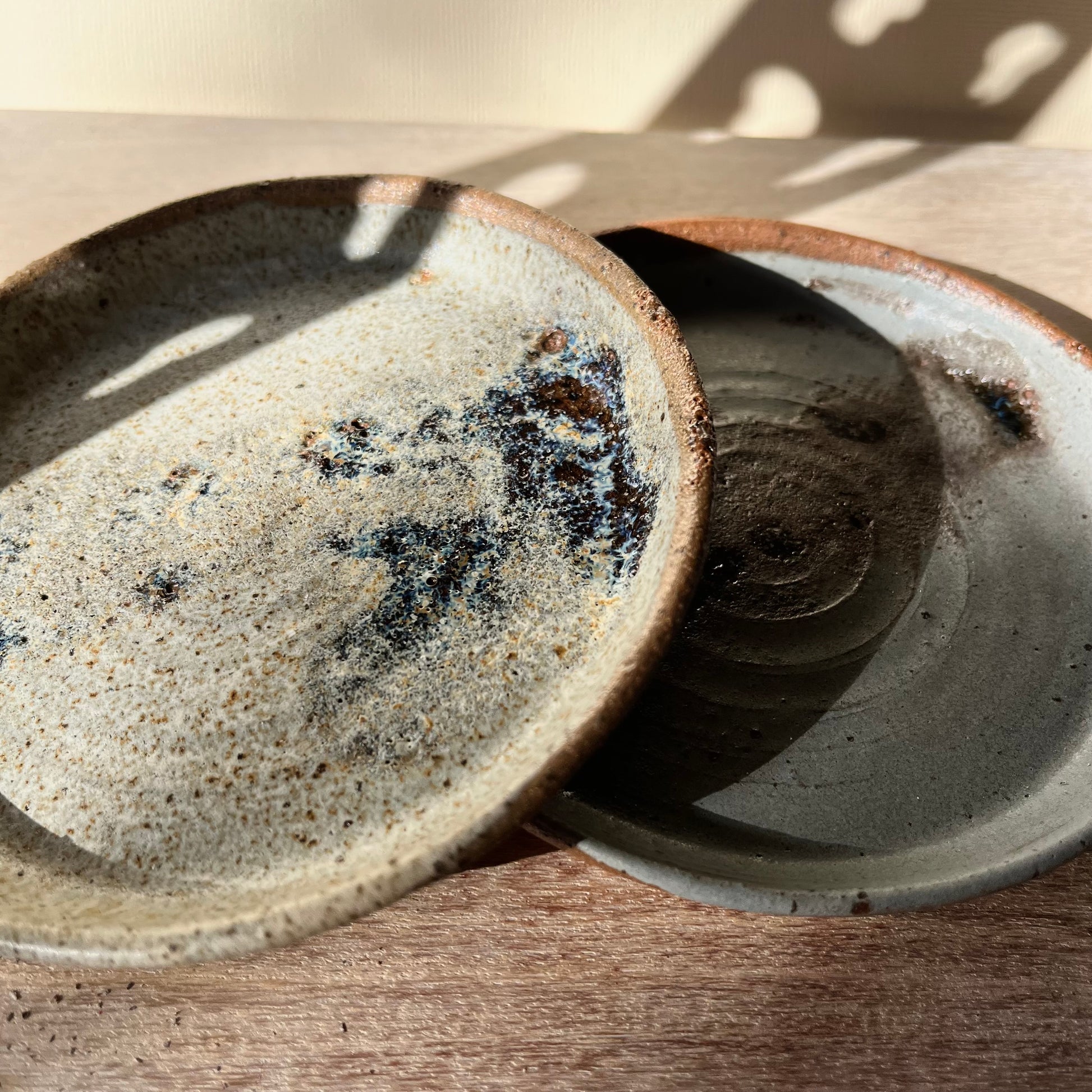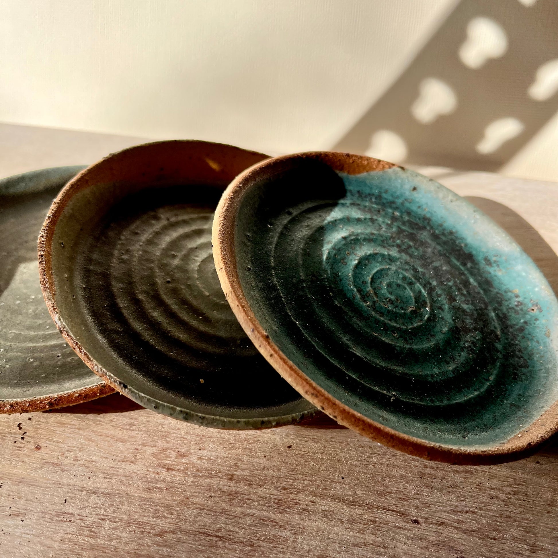 These small dishes are wheel-thrown and left with the visible swirl of the wheel at their centre, marking the making process. The lightly grogged clay gives the surface a subtle texture, with the rim and base showing the character of the clay body beneath the glaze. Each piece is finished in one of several glaze variations, with natural differences in surface and depth created during firing. Suitable for a range of uses, they work well as side plates, soap dishes, pet dishes, or small utility bowls around the home.