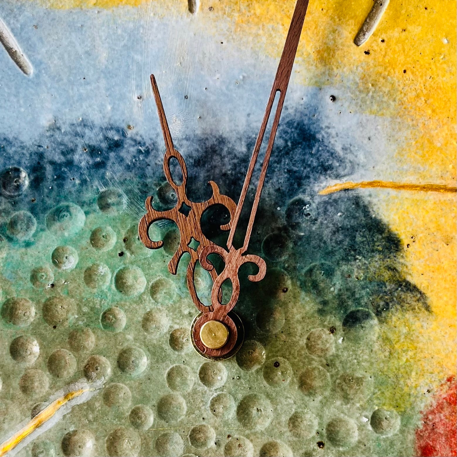 A one-off wall piece with layered colour that moves gently from deep blue into green, warm yellow and soft ember red. The textured surface catches light in small shifts, giving the clock a quiet depth. Two fine gold line sit across the face, adding a clean contrast to the earthy palette. The carved hour marks and wooden hands keep the design simple and balanced. A functional artwork that brings warmth and subtle movement to any space.