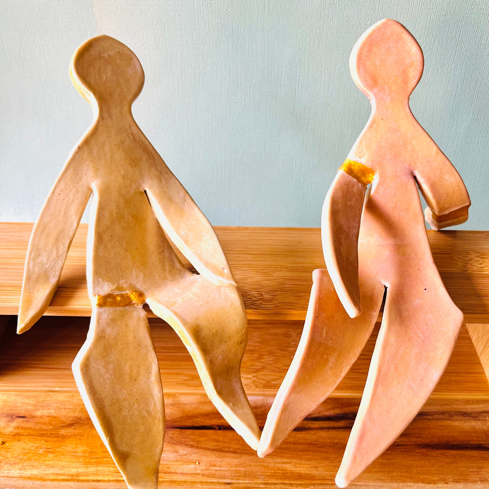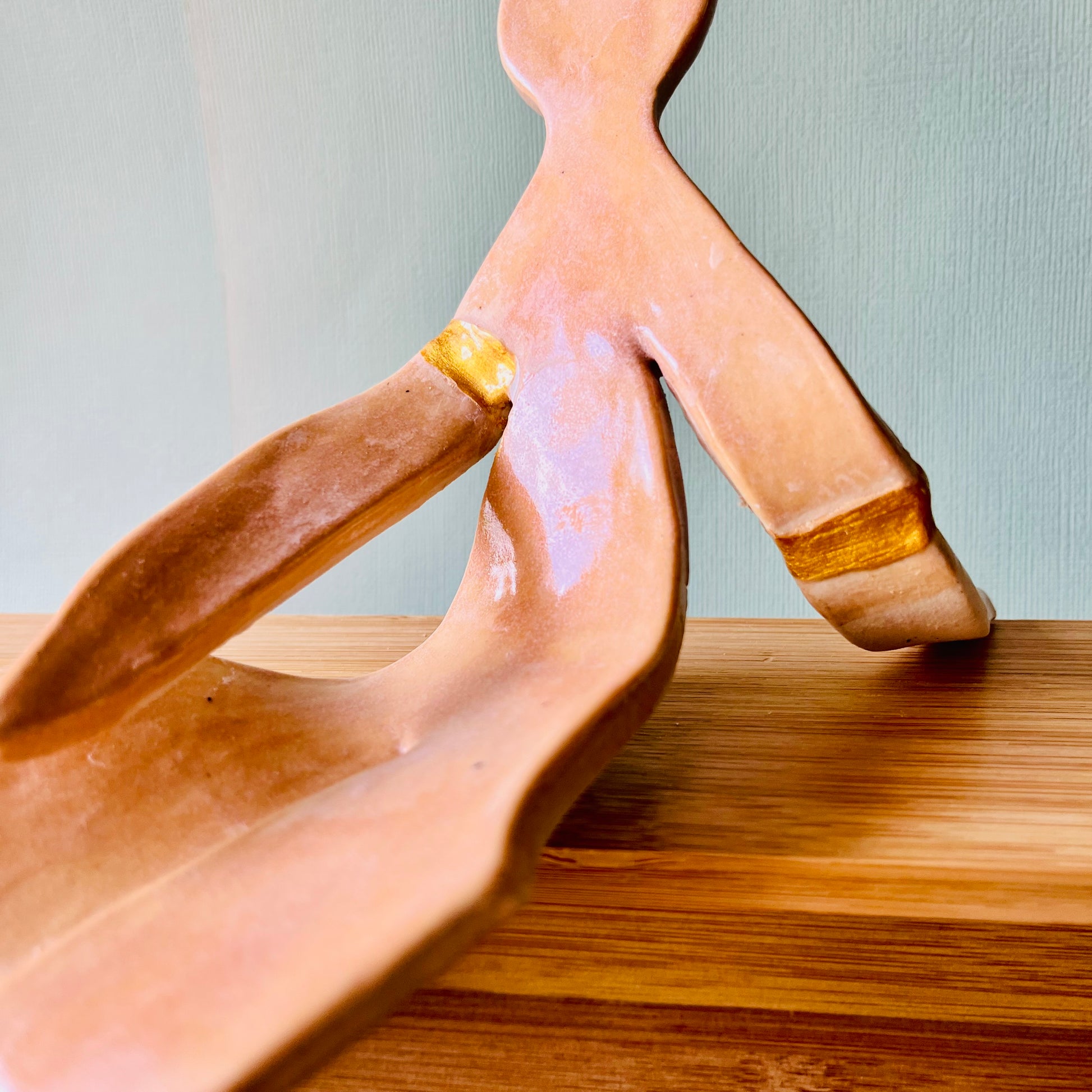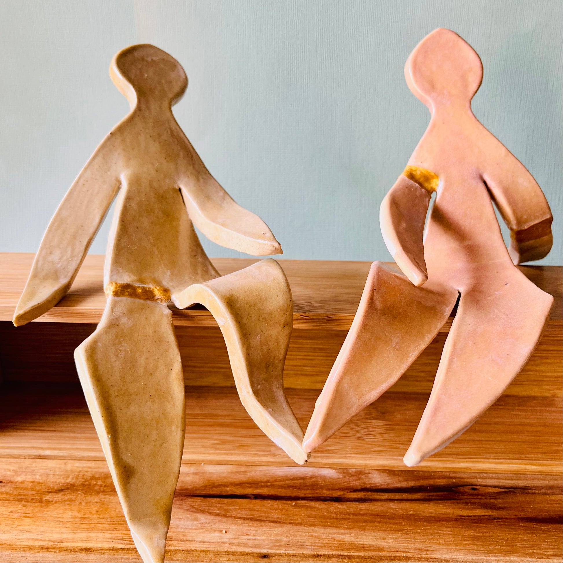 This hand-sculpted ceramic figure features a relaxed, abstract form glazed in a range of colours. Some feature gold highlights. Designed to sit casually on a shelf, ledge, or windowsill, it adds a quiet presence and touch of character to any space.With its slouched posture and gentle lean, the figure suggests stillness and reflection.