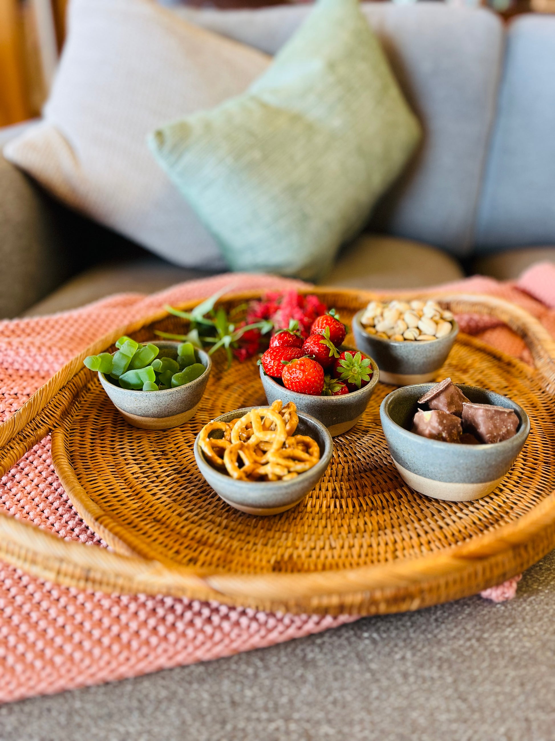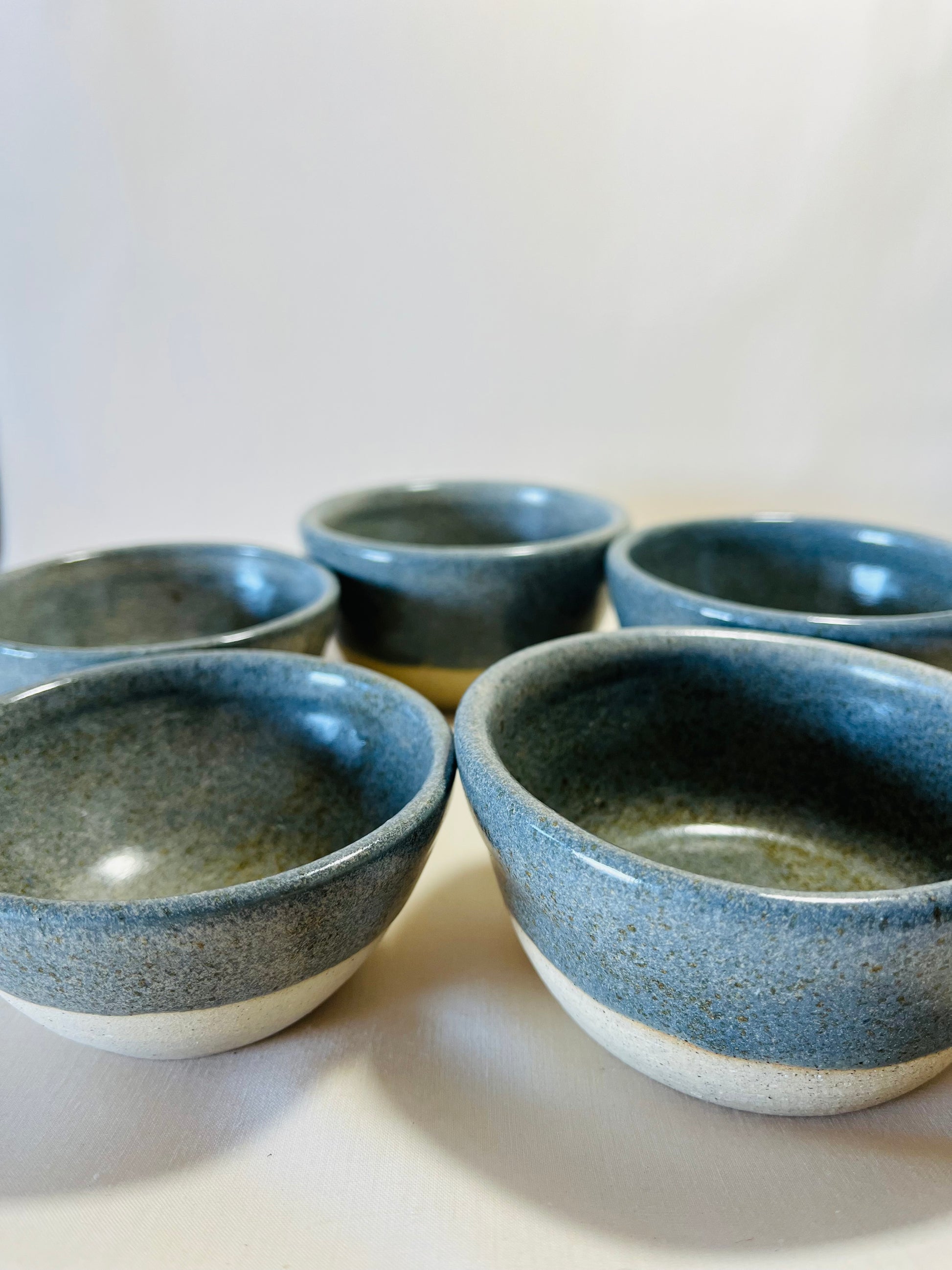 A stackable set of five unique, hand-shaped bowls, each varying slightly in size and shape to nest neatly inside the next. Perfect for olives, dips, nuts or pulling together a snack board — practical, beautiful, and made for everyday gatherings. Glazed in Galenta, a soft blue with light speckles and warm clay tones showing through.