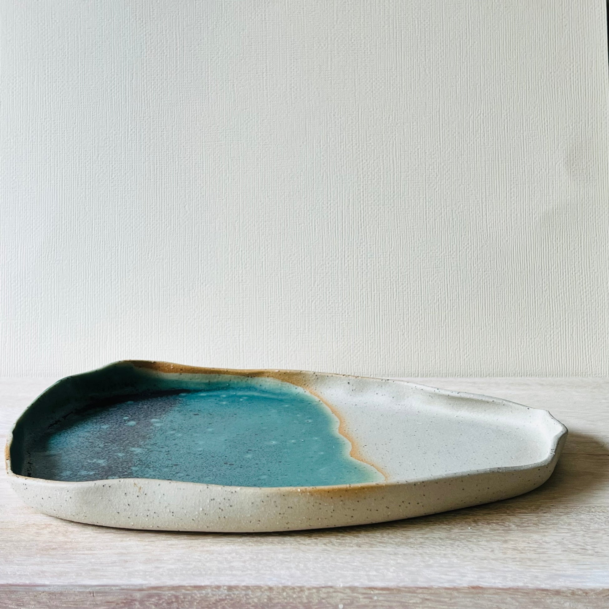 Hand-formed stoneware trays finished in a deep sea green glaze that shifts from dark to light across the surface. Warm clay breaks along the edges highlight the organic shape. Use them for serving, styling, or as a catch-all around the home. Available in a range of sizes to suit different spaces.