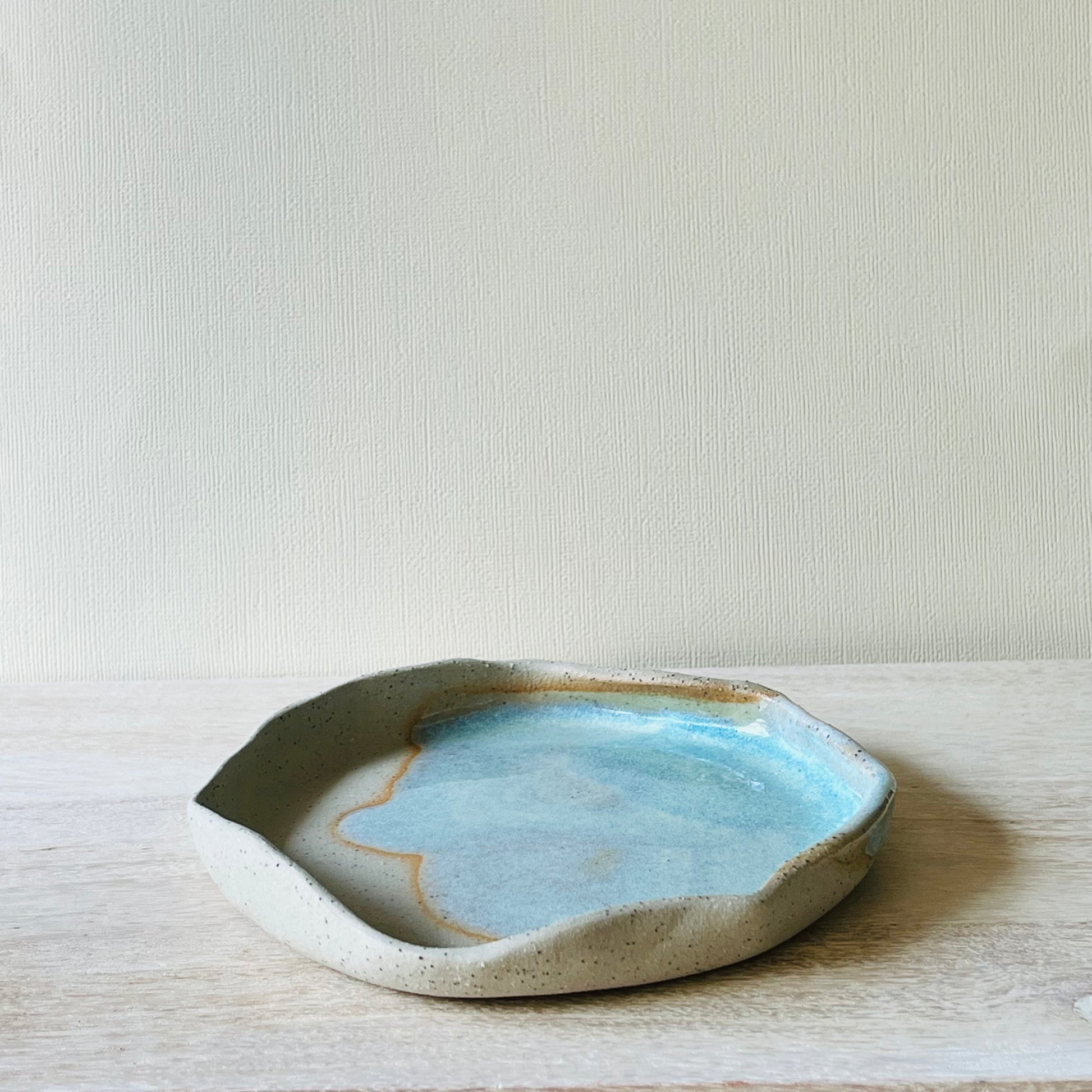 Hand-formed stoneware trays finished in a glacial blue glaze that shifts from dark to light across the surface. Warm clay breaks along the edges highlight the organic shape. Use them for serving, styling, or as a catch-all around the home. Available in a range of sizes to suit different spaces.