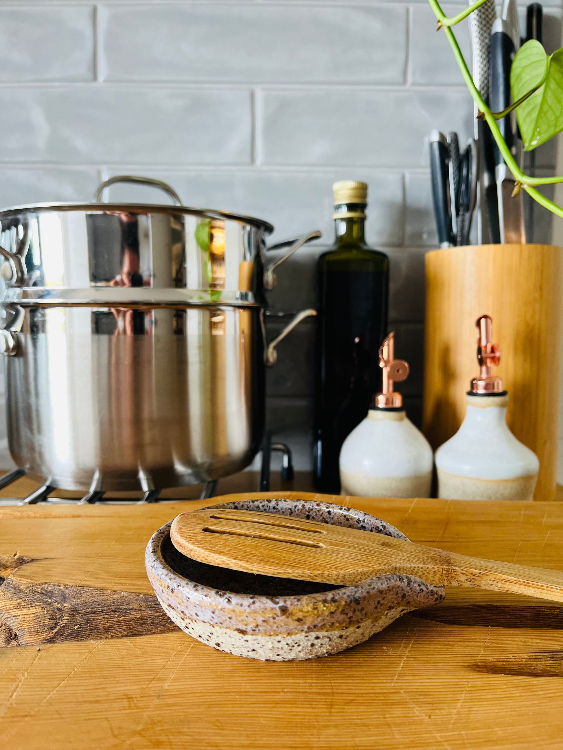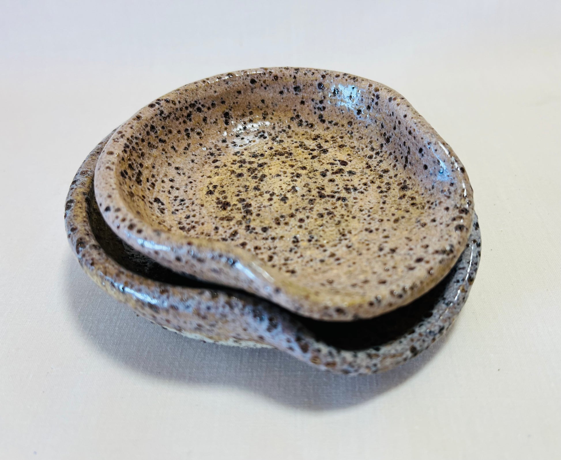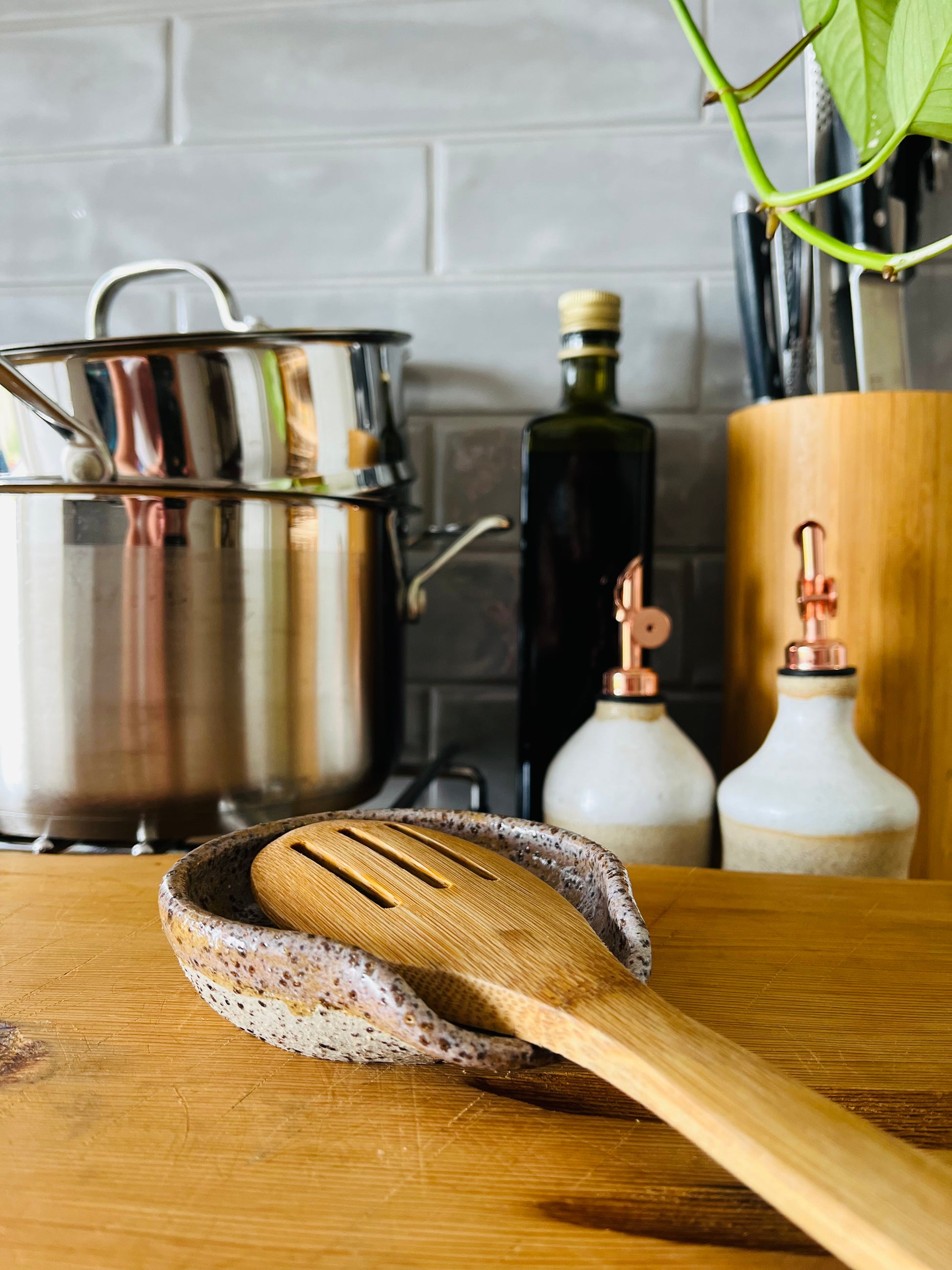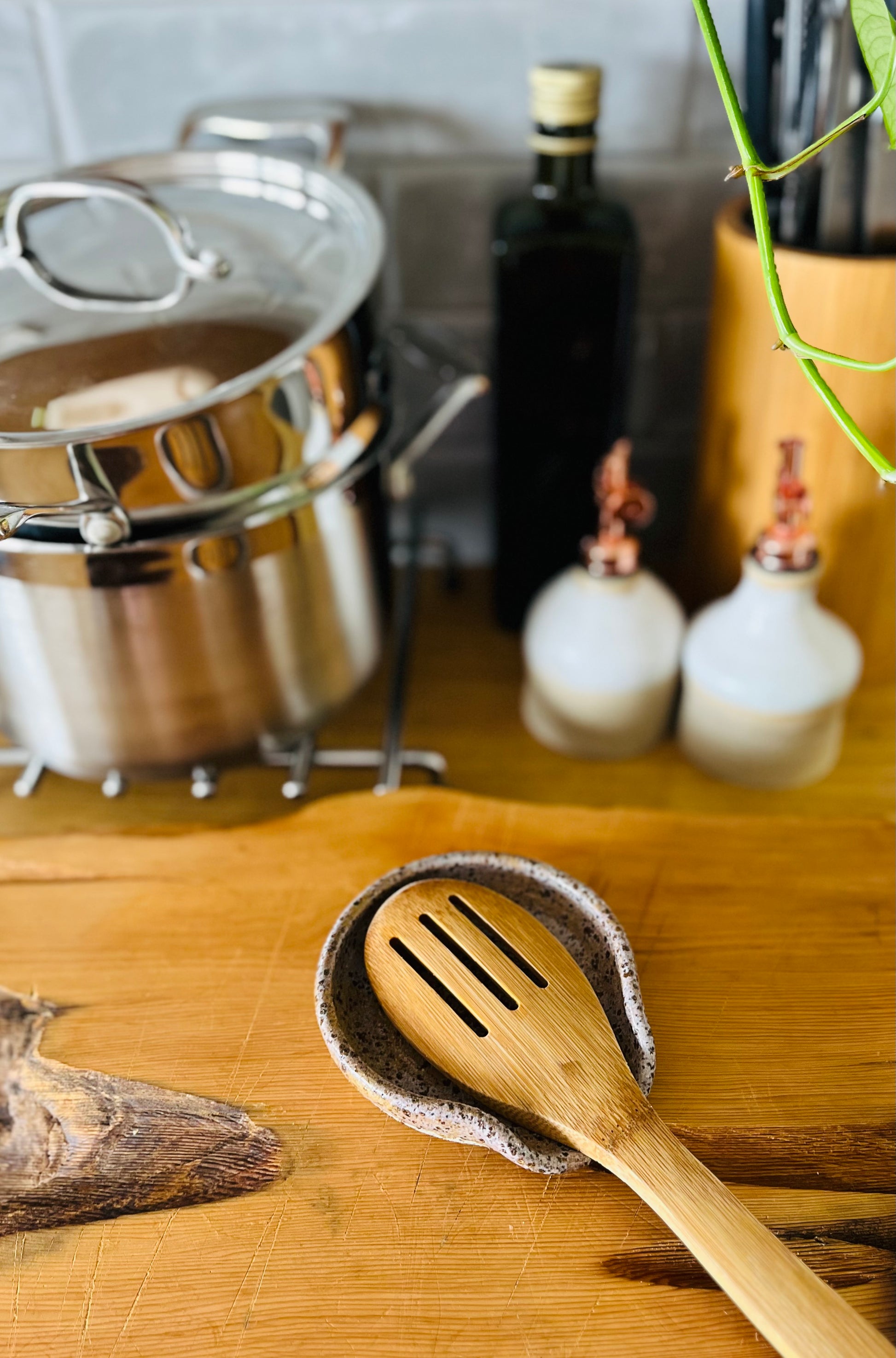 A round, lipped rest for your wooden spoon — or whatever’s doing the hard work. Glazed in coral, a soft pink hue with brown speckled splotches breaking through from the trachyte in the clay. Sits steady beside the stove, ready to catch the slops so your bench doesn’t have to. Rest easy. Pair it with the matching smaller rest — perfect for teaspoons and smaller spoons to have their moment too.