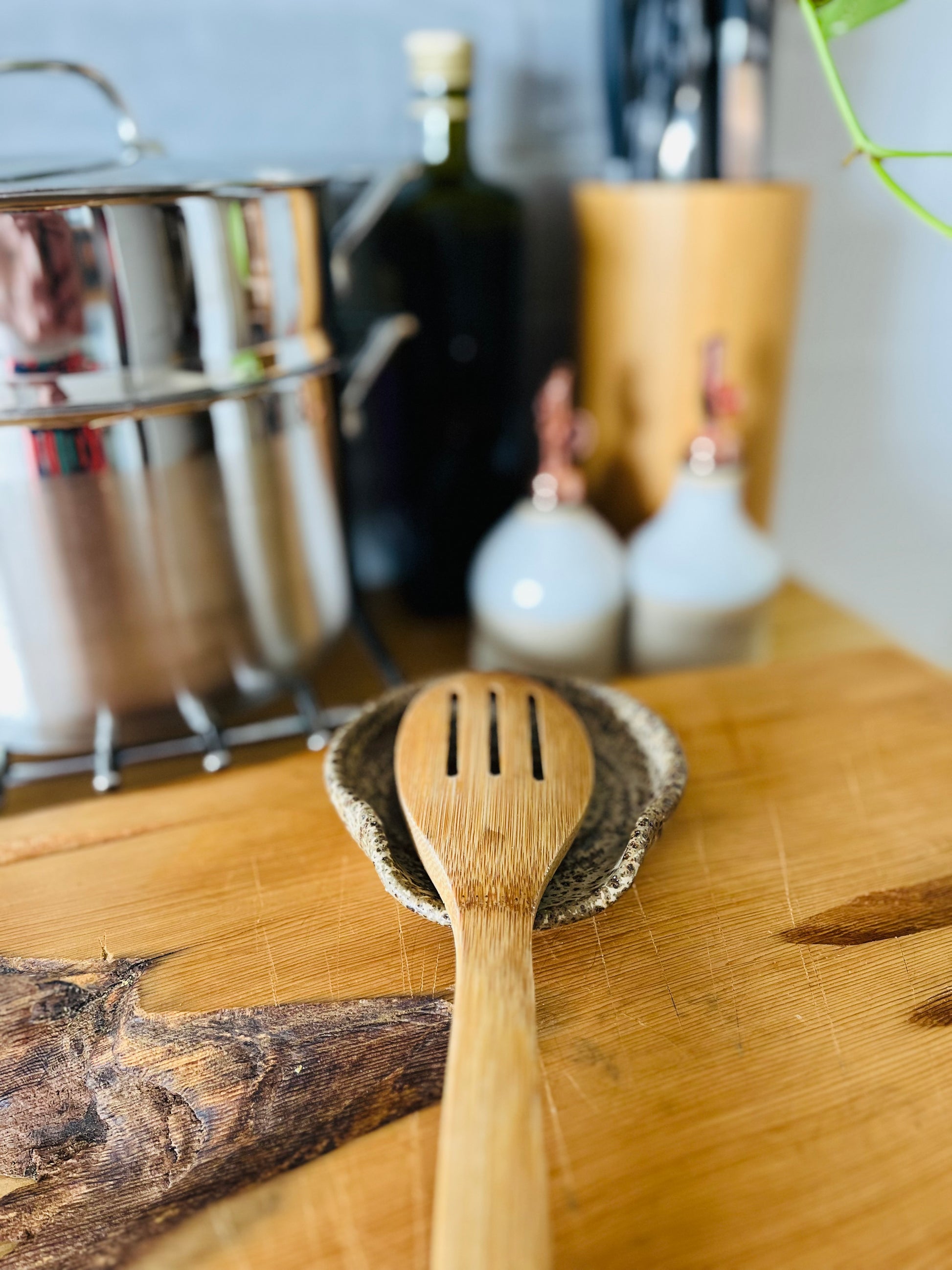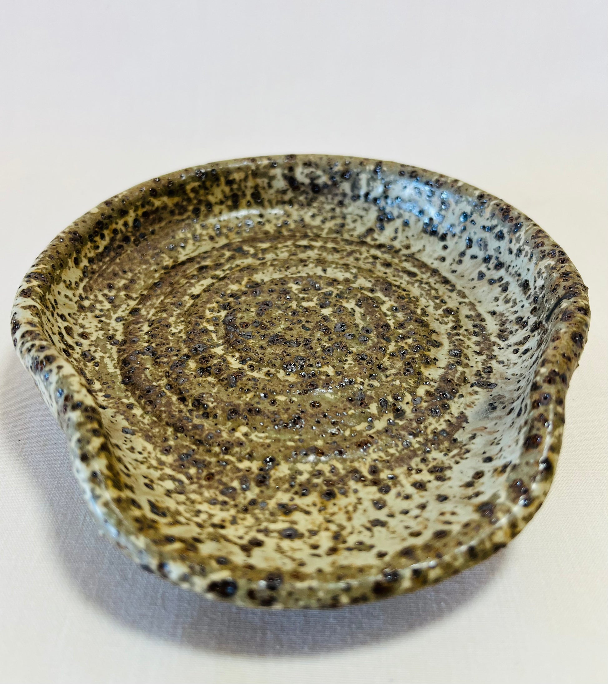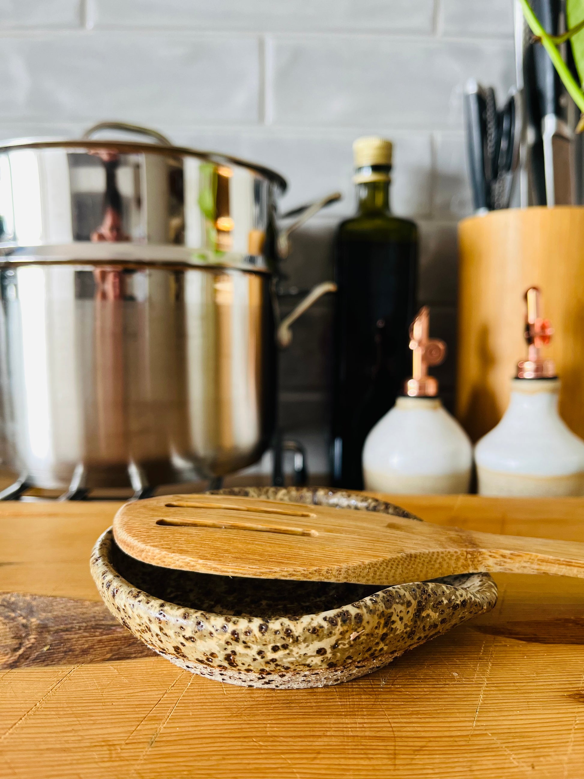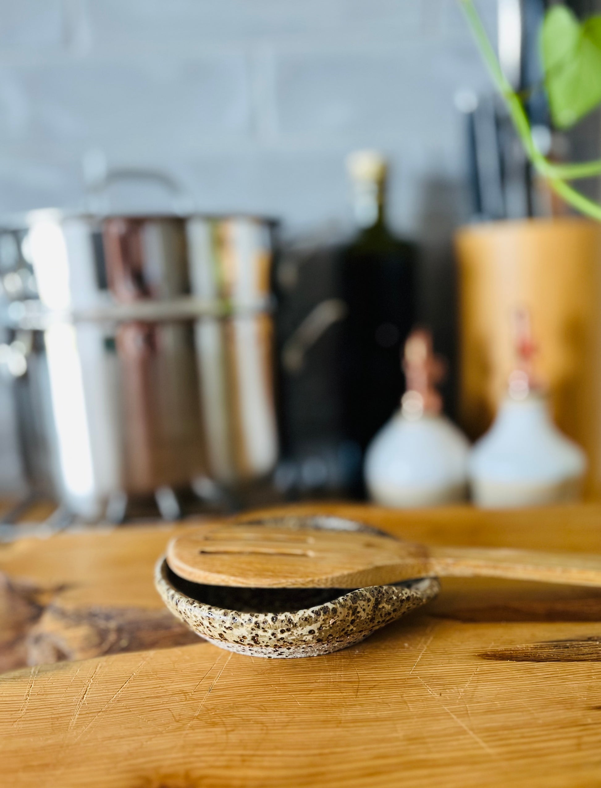 A round, lipped rest for your wooden spoon — or whatever’s doing the hard work. Glazed in teahouse, a muted beige hue with brown speckled splotches breaking through from the trachyte in the clay. Sits steady beside the stove, ready to catch the slops so your bench doesn’t have to. Rest easy. Pair it with the matching smaller rest — perfect for teaspoons and smaller spoons to have their moment too.